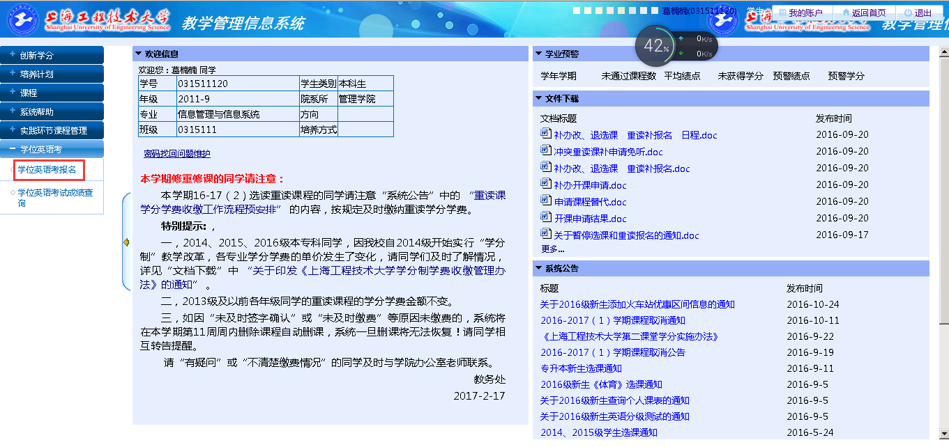 进入学生端教务系统的主页,在左侧菜单栏找到“学位英语考”一级菜单,然后点击“学位英语考报名”2级菜单即可进入报名页面进行报名