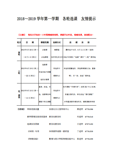 2018~2019学年第一学期 各轮选课 友情提示