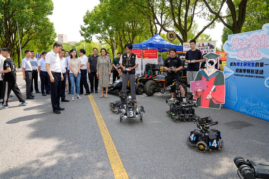 学生们自主研发的“进击的巨人”、搭配仿真机器狗,现场演绎多个复杂动作,瞬间燃爆全场;投篮机器人搭载精准定位系统,如同神射手一次次将球稳稳投入篮筐;巴哈赛车与方程式赛车,木鸢战队携英雄机器人、轮腿步兵机器人轮番登场,上演了一场“硬核机械大秀”。“未来转盘”也成了“爆款打卡点”,转盘上是工程管理、智慧交通、数字经济等专业板块,对应着“战略思维、数据分析、数字运用、产业设计”等不同能力的需求,充分彰显了学科交叉的融合魅力,也让“工程、管理、设计三旋翼协同”的理念变得可触可感。