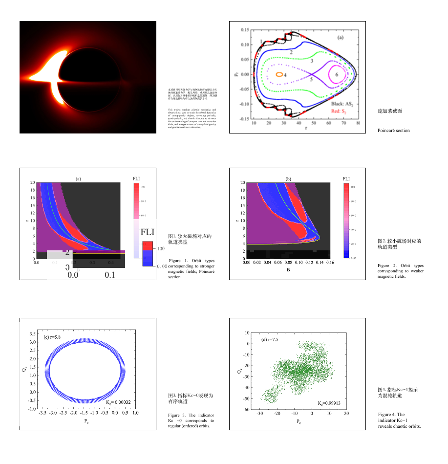 正是基于这一国际前沿热点问题,获批项目计划借助天体力学理论和方法开展黑洞、中子星等强引力天体轨道动力学和物理性质研究。利用空间望远镜的观测数据筛选搜寻一些X射线双星等的高频准周期振荡;将X射线双星等高频准周期振荡与蒙特卡洛马尔科夫链统计方法给出磁化更改引力旋转黑洞参数和磁场强度限制范围。获得黑洞附近带电粒子、光子的周期、准周期和混沌轨道特征,揭示它们在引力波形、黑洞阴影和喷流上的表现行为。