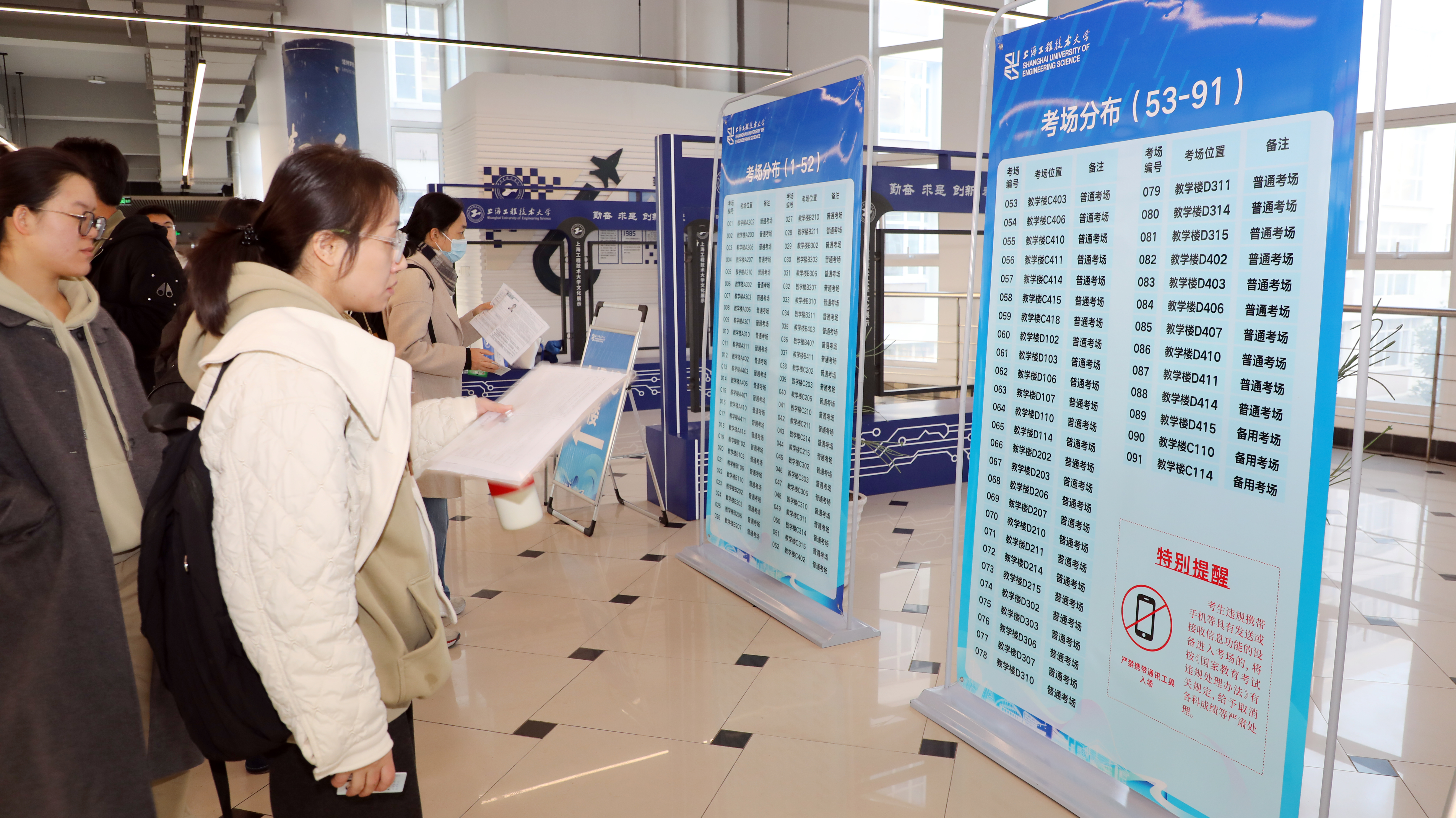 此次我校承担了2620名考生的考试任务,共设91个标准化考场,涉及安徽、浙江两省共计50家招生单位。为严格落实教育部、上海市教育考试院2026年全国硕士研究生招生考试要求,学校多次召开组考工作协调会并进行2轮考前培训,采用智能安检门与金属探测仪相结合的“1+1”双安检模式,严防手机等电子设备带入考场。全面落实并应用保密室智能巡检系统和考场智能巡考系统,筑牢“公平研考”“公正研考”的安全防线。